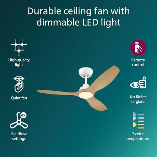 Philips Olas Ceiling Fan, 3 Blades, 24W LED Light, DC Motor, Color Temperature Range (3000K-4300K-6500K) with Dimmable Function, Remote Included, 52", white and wood
