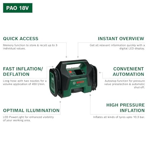 Bosch Cordless Air Compressor PAO 18V (for Inflating Everything from Tires to Large inflatables; incl. Tyre Valve air Pump Clip, French-Valve, Ball Needle, Volume Adapter)