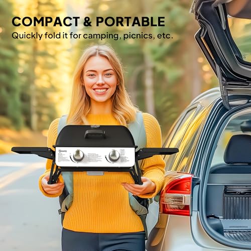 Outsunny 2 Burner Gas BBQ Grill with Foldable Side Tables, Portable Tabletop Gas Barbecue Grill with Built-in Thermometer, Lid, Grease Tray for Garden Party Camping Picnic Outdoor Cooking 5.6KW, Black