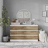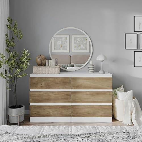 URBNLIVING Modern White Wooden Chest with Oak 6 Drawers for Bedroom or Office Storage Versatile Bedside Table and Stylish Cabinet for Organizing Clothes Accessories Work Place Supplies and Items
