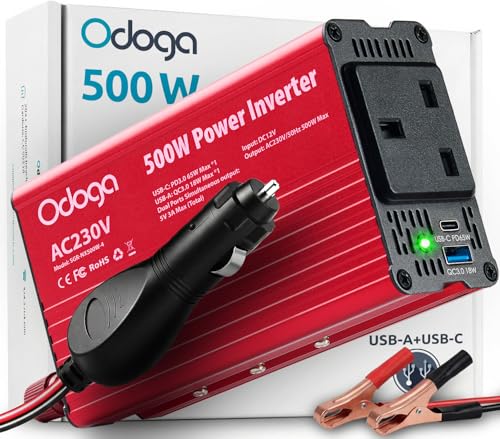 Odoga 500W Power Inverter 12V to 230V – Car Plug Adapter to UK Plug Socket, DC to AC Wall Outlet 3 Pin Plug, USB-A & USB-C Charger Ports for Laptop, Mobile Phones, Tablets, Consoles & More