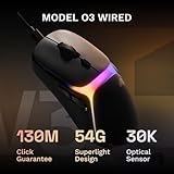 GLORIOUS Gaming Model O3 Wired Gaming Mouse - Ultralight 54g Weight, 130M Click Optical Switches, 30K DPI BAMF 3.0 Sensor, 750 IPS Tracking, 50G Acceleration, Supports All Grip Types - Black
