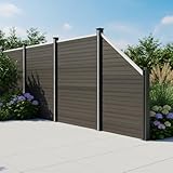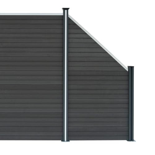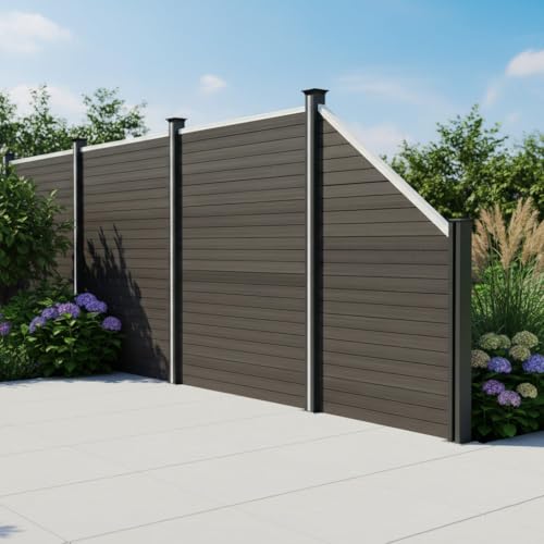 Composite Angled Fence Panel Grey 6ft Tall Slanted Board & 1 x 105cm Aluminium Post Plastic PVC Wood Grain Fencing Slats Double Sided Plank 100cm W x 180cm H Outdoor Garden Driveway Privacy Barrier