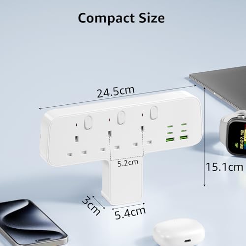Banaplo Plug Extension Socket, 9-IN-1 Multi Plug Adaptor 3 Way 6 USB(3.8A,4 Type-C), 13A 3250W Plug Adapter UK, Wall Plug Extender with Individual Switches for Home Office Kitchen(White)