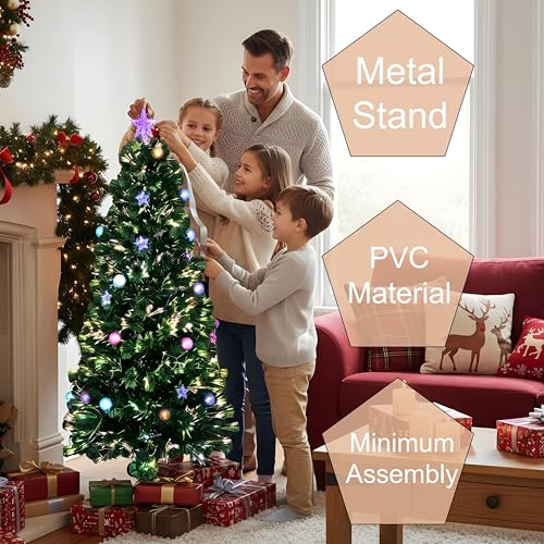 5Ft/150cm Fibre Optic Christmas Tree with Star Topper - Baubles and Stars Decorations - Pre-Lit Green Artificial Xmas Tree - Multicolor Changing Lights