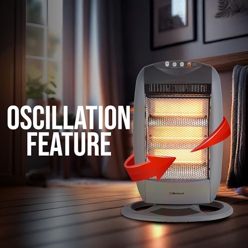 Belaco Electric 3 Bar Halogen Heater 1200W, Portable Room Heater with 3 Heat Settings, 90° Oscillation, Tip Over Safety Switch, Compact Carry Handle, Grey