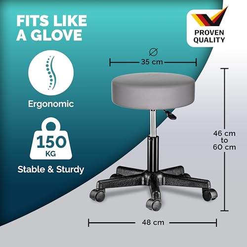 CASARIA® 35cm Grey Rolling Stool with Wheels | Height Adjustable | 360° Rotatable Padded Swivel Roll Chair | Double Castors | Comfortable Upholstered Seating | Office Workshop Salon