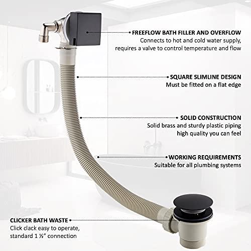 ENKI, W49, Square Cascade Waterfall Freeflow Bath Filler Waste and Overflow, Bath Filler Tap, with Click Clack Bath Waste, Slimline Design, Matte Black