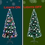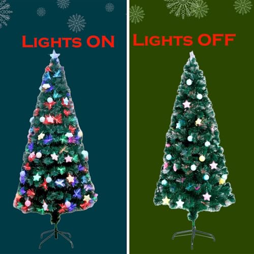 5Ft/150cm Fibre Optic Christmas Tree with Star Topper - Hanging Pastel Stars & Baubles Decorations - Pre-Lit Green Artificial Xmas Tree - Multicolor Changing Lights