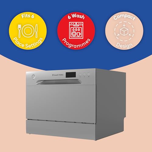Russell Hobbs Table Top Dishwasher Compact Mini with 6 Place Settings, LED Display, Button Control, 6 Programmes, Portable & Efficient, 24hr Timer, Rinse & Eco Mode in Silver, RH6TTDW0D1S