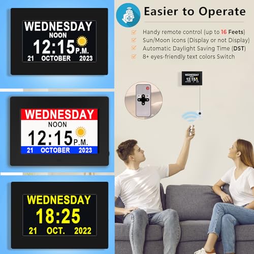 Véfaîî Dementia Clock 2.0 with Auto DST, 20 Custom Reminders, Day Clock with Sun/Moon icons for Elderly, Sleep Trainer, 7" with Remote & HD Picture Frame